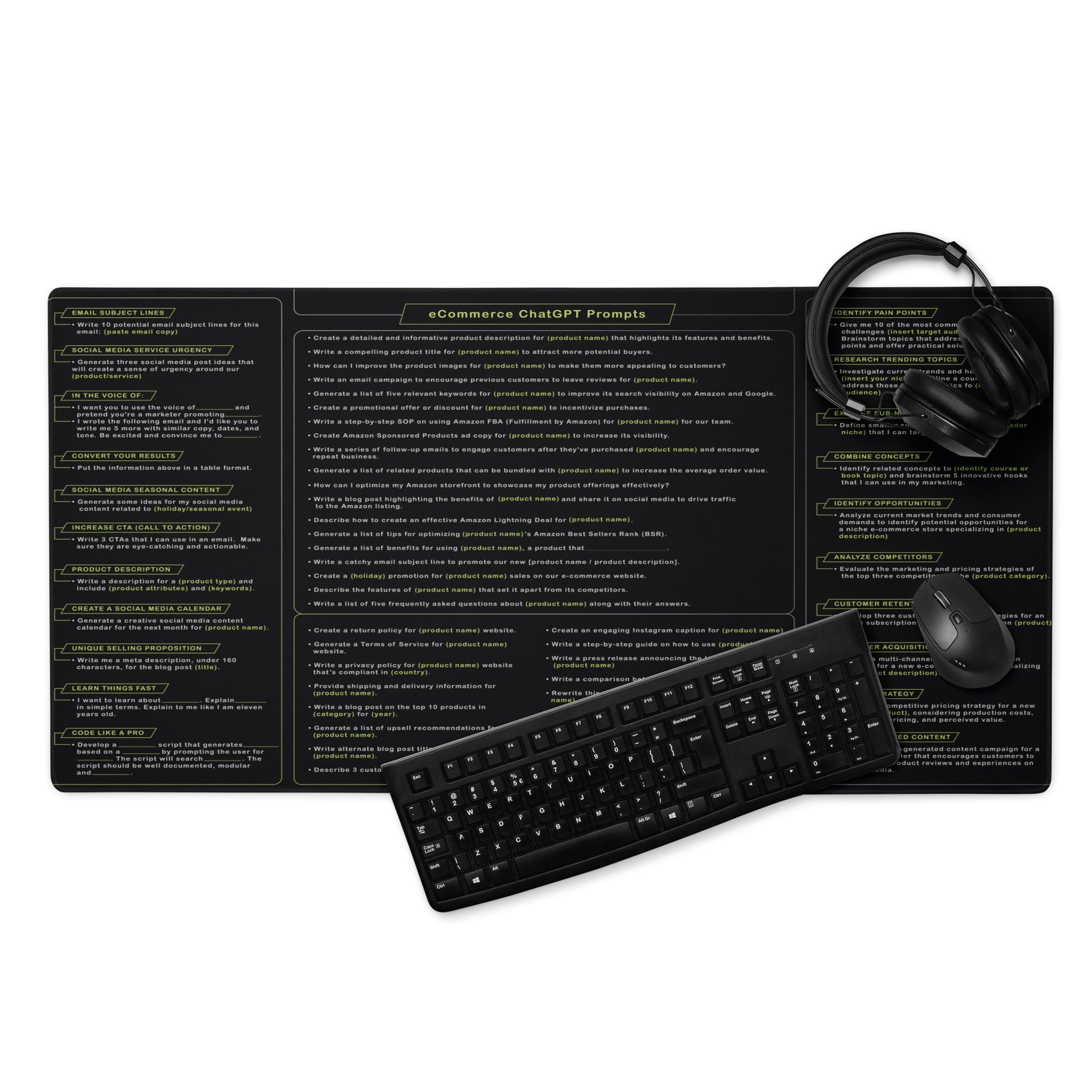 Featuring a carefully curated collection of AI and ChatGPT prompts, this desk mat is your go-to resource for generating fresh ideas, optimizing your marketing strategies, and growing your ecommerce venture. Whether you're a business owner, course creator, or freelance marketer, these prompts will help you unlock your creativity and tackle your biggest challenges with ease.