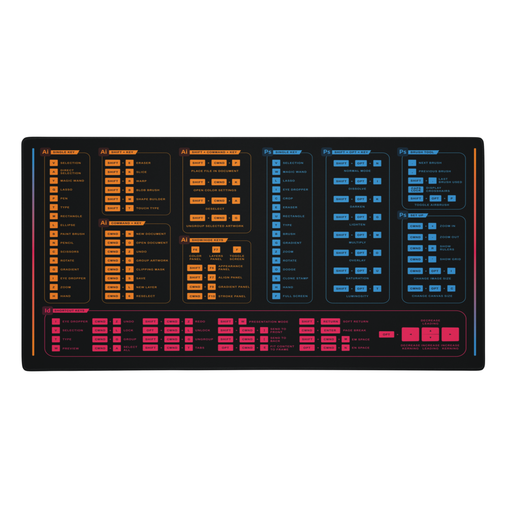 Introducing the ultimate productivity tool for graphic designers using Adobe Illustrator, Photoshop, and InDesign on a Mac: The Graphic Designer's Essential Desk Mat for Mac. This innovative desk accessory is designed to streamline your workflow, boost your creativity, and help you master your favorite Adobe Creative Suite applications on your Mac.